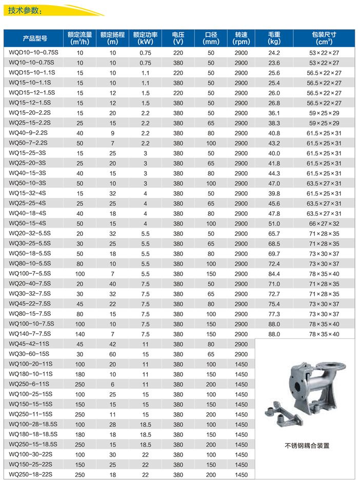 1、國標法蘭WQ(D)-P全不銹鋼精密鑄造污水污物潛水電泵采用不銹鋼精密鑄造外殼,具有耐腐蝕,環(huán)保型、揚程高、流量大等特點。