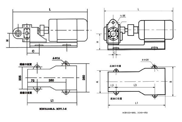 KCB18.3-200、2CY1.1-12齒輪式輸油泵配帶管螺紋口的腰形法蘭;其余泵不配帶法蘭,當用戶需要配帶法蘭時,應在訂貨中注明。